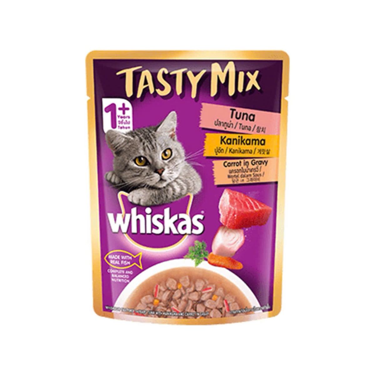 Pate Whiskas Tasty Mix (Gravy) loại Cá ngừ - Thanh cua - Cà rốt cho mèo